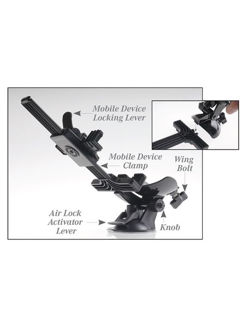 PINCE POUR APPAREIL MOBILE Réglable pour s’adapter à la plupart des appareils mobiles! ACTIVATEUR AIR-LOCK Appuyez sur la languette pour verrouiller votre Mega-Bator sur pratiquement n’importe quelle surface plane et dure.
